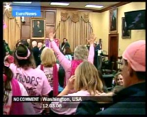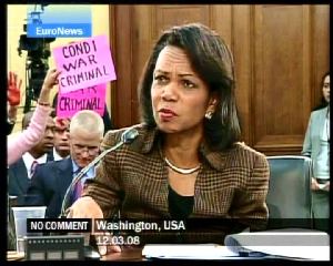 Hier mal ein paar Bilder aus einem "No Comment" von Euronews. Bei einer Anhörung wird Mrs.Rice von Aktivistinnen von "Code Pink" belagert, die ihre "blutbefleckten" Hände hochrecken und Rice immer wieder das Wort "War Criminal" entgegenrufen.