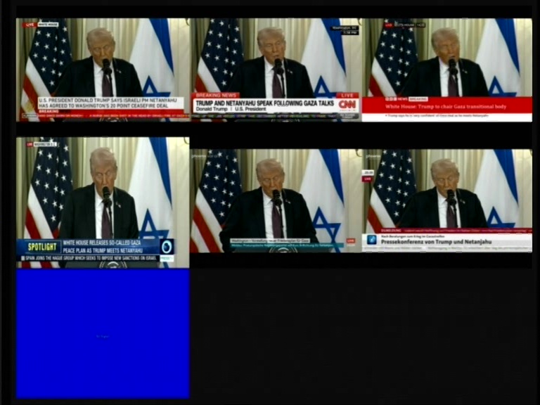 Der Live-OT der PK von Donald und Netanjahu im Weißen Haus. Donald platzt förmlich vor Stolz auf seinen (?) "historischen" Erfolg und deutet mehrmals seine Erwartung an, dafür den Friedensnobelpreis zu kriegen. Von den Details des "Friedensplans" hat er dabei kaum etwas mitbekommen und muss alles sehr mühsam vom Blatt ablesen. - Und das hatten wir auch schon länger nicht mehr: für 40 Minuten war bei allen wesentlichen Sendern dasselbe Bild zu sehen. |